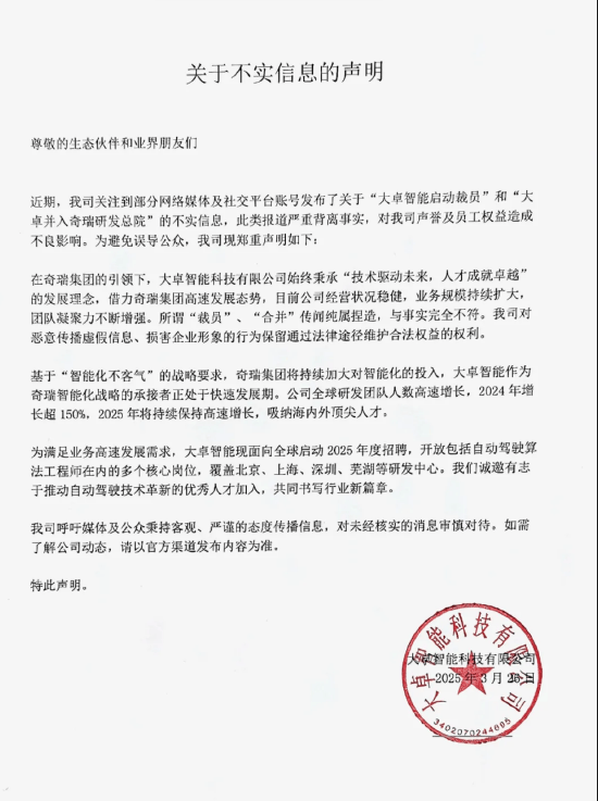 仟茂科技讯 3月26日上午消息,奇瑞集团旗下大卓智能发布声明称,公司关注到部分网络媒体及社交平台账号发布了关于“大卓智能启动裁员”和“大卓并入奇瑞研发总院”的不实信息,此类报道严重背离事实。所谓“裁员”、“合并”传闻纯属捏造,与事实完全不符,公司对恶意传播虚假信息、损害企业形象的行为保留通过法律途径维护合法权益的权利。 责任编辑:江钰涵 (责任编辑:张晓波 )