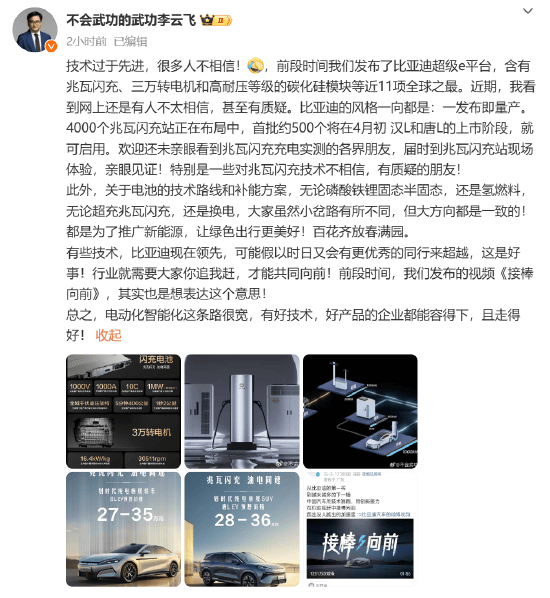 仟茂科技讯 3月26日午间消息,比亚迪集团品牌及公关处总经理李云飞在微博发文称,“前段时间我们发布了比亚迪超级e平台,含有兆瓦闪充、三万转电机和高耐压等级的碳化硅模块等近11项全球之最。近期,我看到网上还是有人不太相信,甚至有质疑。比亚迪的风格一向都是:一发布即量产。”李云飞表示,4000个兆瓦闪充站正在布局中,首批约500个将在4月初汉L和唐L的上市阶段就可启用。 李云飞还谈到,关于电池的技术路线和补能方案,无论磷酸铁锂固态半固态,还是氢燃料,无论超充兆瓦闪充,还是换电,大家虽然小岔路有所不同,但大方向都是一致的,都是为了推广新能源,让绿色出行更美好。 责任编辑:江钰涵 (责任编辑:张晓波 )