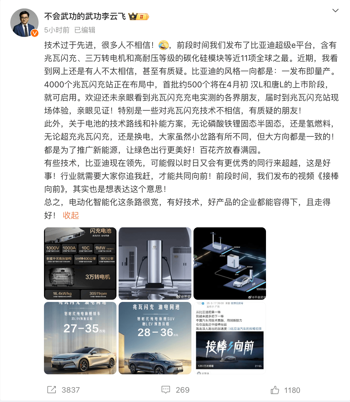 凤凰网科技讯(作者/冯皓钦)3月26日,据悉,今日上午,比亚迪集团品牌及公关处总经理李云飞就外界对兆瓦闪充基建落地速度、技术兼容性及成本控制等质疑在微博进行回应,李云飞称,比亚迪日前发布的“兆瓦闪充站”正在布局中,首批约500座充电站将在4月初的汉L、唐L上市阶段启用。 据了解,李云飞表示,电池的技术路线和补能方案,无论是磷酸铁锂、固态、半固态、氢燃料,还是超充、闪充、换电,技术路径虽异但目标一致。 据此前报道,2025年开年,比亚迪从全民智驾、智能生态与补能效率三个维度开展技术研发。今年2月以来,比亚迪陆续发布了全民智驾战略、“灵鸢”车载无人机系统等新技术。3月17日,比亚迪发布了新一代纯电平台“超级e平台”。值得注意的是,超级e平台具备兆瓦闪充、三万转电机和高耐压等级的碳化硅模块等近11项全球之最。 (责任编辑:张晓波 )