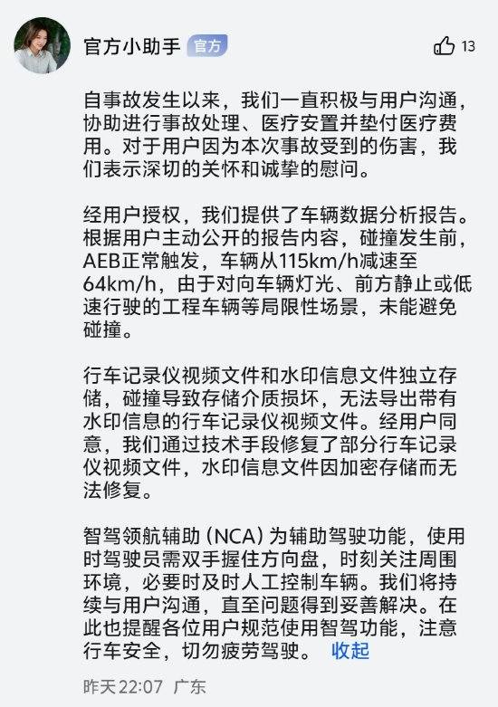仟茂科技讯 3月27日上午消息,一位问界M7车主近日在鸿蒙智行App发帖称,自己在开启智驾功能时出车祸,车报废了,人受伤没死。 据他描述,自己是第二届华为智驾大师赛2024年12月3日-22日个人周榜单第一名。2024年12月22日晚上九点半左右,开着 NCA功能120km/h的速度追尾了前方停着的水泥泵车,车辆当场报废,被交警和前方司机救下。 他在帖子中质疑“余总在发布会上说不管白名单黑名单都能识别,自称L2.9999,只等L3出台就是L3等等公开言论,你们是不是草营人命,拿我们客户的生命开玩笑?” 针对此事,鸿蒙智行App官方回复称,自事故发生以来,我们一直积极与用户沟通,协助进行事故处理、医疗安置并垫付医疗费用。对于用户因为本次事故受到的伤害,我们表示深切的关怀和诚挚的慰问。经用户授权,我们提供了车辆数据分析报告。根据用户主动公开的报告内容,碰撞发生前,AEB正常触发,车辆从115km/h减速至64km/h,由于对向车辆灯光、前方静止或低速行驶的工程车辆等局限性场景,未能避免碰撞。 “智驾领航辅助(NCA)为辅助驾驶功能,使用时驾驶员需双手握住方向盘,时刻关注周围环境,必要时及时人工控制车辆。我们将持续与用户沟通,直至问题得到妥善解决。在此也提醒各位用户规范使用智驾功能,注意行车安全,切勿疲劳驾驶。” 责任编辑:江钰涵 (责任编辑:张晓波 )
