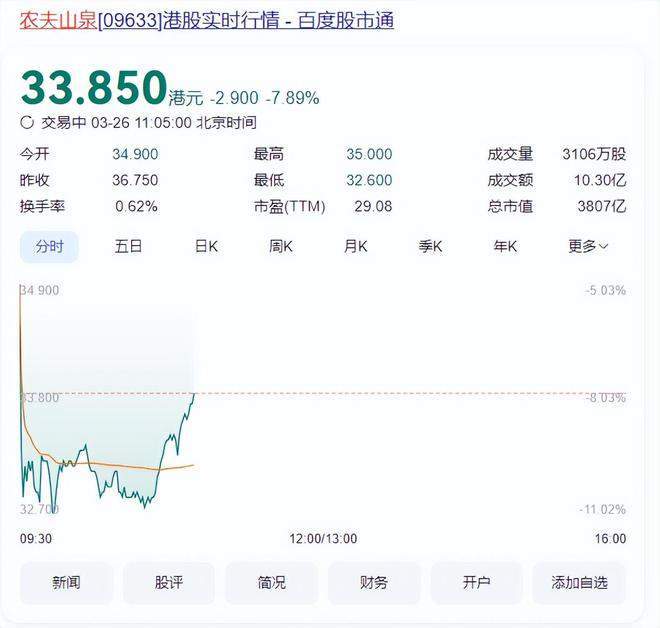 格隆汇3月27日|中金报告指,农夫山泉(9633.HK)去年业绩符预期,预计今年收入有望在低基数下重回双位数增长,考虑市场估值上行,上调目标价14%至40港元,维持“跑赢行业”评级。 中金指,农夫山泉包装水市占率有望在低基数下进一步回升。根据调研显示,今年1至2月在高基数下水降幅显著收窄,“东方树叶”维持稳健增长,预计今年或有望适当收缩“绿瓶”水折扣力度,通过品牌建设及新规格等动作推动“红瓶”水市占率回升。茶饮方面,有望加强品牌营销端投入及推出新口味等应对行业白热化竞争,进一步扩大无糖茶行业竞争优势。认为外部扰动带来的最差时期基本过去,今年收入有望重回双位数增长。 中金维持该集团今年盈利预测不变,预期纯利为139.88亿元人民币,营业额495.44亿元人民币,即按年增15.38%,及15.5%,预期市盈率25.5倍。预测明年纯利157.7亿元人民币,收入料达552.02亿元人民币,预期市盈率为22.3倍。预期今明两年股息收益率为2.8%及3.2%。 (责任编辑:宋政 HN002)