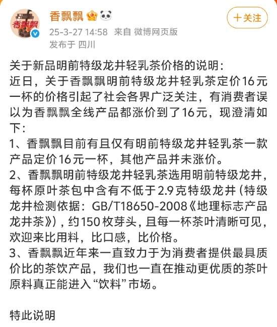 3月27日下午消息,@香飘飘(603711)今日在官微发布关于新品明前特级龙井轻乳茶价格的说明。近日,关于香飘飘明前特级龙井轻乳茶定价16元一杯的价格引起了社会各界广泛关注,有消费者误以为香飘飘全线产品都涨价到了16元,现澄清如下:香飘飘目前有且仅有明前特级龙井轻乳茶一款产品定价16元一杯,其他产品并未涨价。 香飘飘明前特级龙井轻乳茶选用明前特级龙井,每杯原叶茶包中含有不低于2.9克特级龙井(特级龙井检测依据:GB/T18650-2008《地理标志产品 龙井茶》),约150枚芽头,且每一杯茶叶清晰可见,欢迎来比用料,比口感,比价格。 (责任编辑:宋政 HN002)