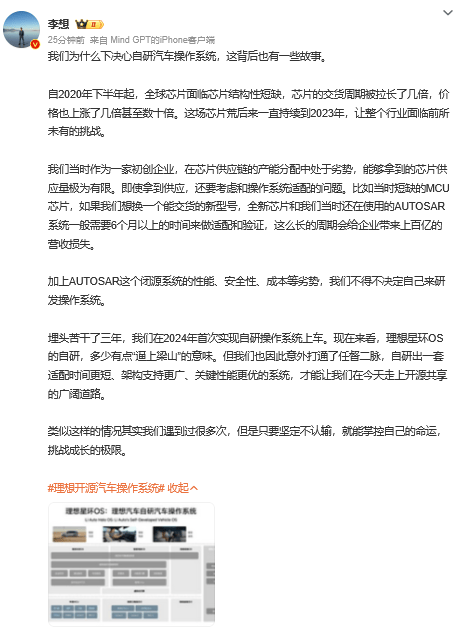 凤凰网科技讯 (作者/彭坤苹)3月27日,理想汽车CEO李想在社交媒体发文,透露了其决心自研汽车操作系统背后的故事。他坦言到:现在看来,理想星环OS的自研,多少有点“逼上梁山”的意味。 自2020年下半年起,全球芯片市场陷入结构性短缺困境,芯片交货周期大幅拉长,价格更是飙升数倍乃至数十倍,这一局面持续至2023年,给整个行业带来巨大挑战。 作为初创企业,理想汽车在芯片供应链中处于劣势,芯片获取极为困难。即便拿到芯片,适配操作系统也困难重重。以当时短缺的MCU芯片为例,更换新型号芯片后,与原使用的AUTOSAR系统适配验证需6个月以上,如此长周期会带来巨额营收损失,且AUTOSAR系统在性能、安全性、成本等方面存在劣势。 经过三年努力,理想星环OS诞生,该系统适配时间更短、架构支持更广、关键性能更优,为理想汽车开辟开源共享新通道。 此前,李想在回应“理想汽车自研汽车操作系统开源”时还谈到,理想汽车真诚地希望能帮助整个汽车行业减少重复投入,并为行业走向高阶智能化(智能体Agent)提供可能。开源的理想星环OS可以帮助任何一个品牌每年节省千万甚至上亿的成本,并且让汽车操作系统的性能和安全性达到一个全新的高度。 (责任编辑:刘静 HZ010)