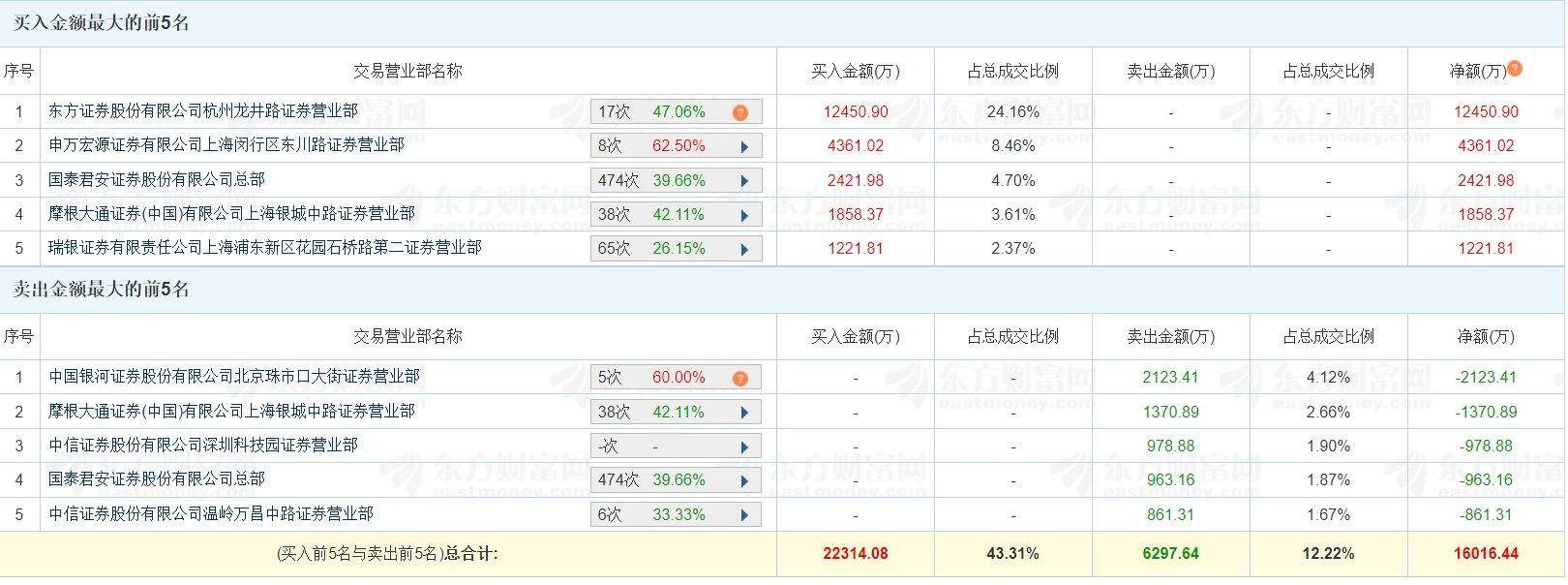 格隆汇3月31日|长阳科技(688299.SH)今日大涨15.11%,换手率10.98%,成交额5.15亿元。龙虎榜数据显示,东方证券(600958)杭州龙井路营业部位列买一席位, 买入1.24亿元;游资“徐留胜”位列买二席位,买入4361.02万元;“量化基金”位列买三席位,买入2421.98万元。上榜席位全天买入2.23亿元,卖6297.64万元,合计净买入1.6亿元。(格隆汇) (责任编辑:宋政 HN002)