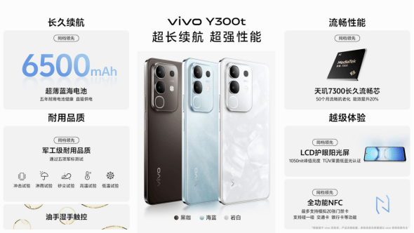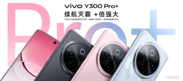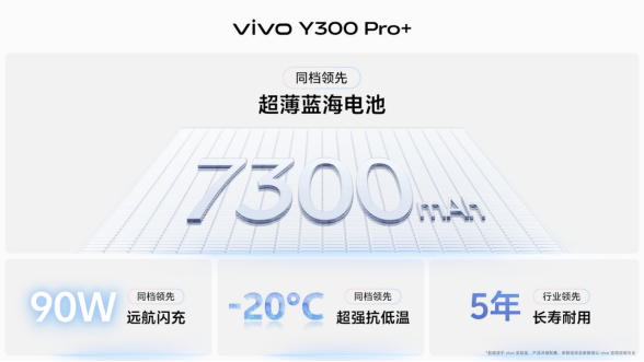 凤凰网科技讯 3月31日,vivo今日正式发布了新款Y系列智能手机Y300 Pro+。Y300 Pro+最大亮点在于搭载了7300mAh超大容量电池,机身厚度仅为7.89mm,为vivo有史以来电池容量最大的手机产品,售价1799元起。 该机型配备了90W远航闪充技术,并支持PPS、UFCS等多种快充协议。在电池耐久性方面,Y300 Pro+采用了“极片隧道技术”和半固态电池技术,官方宣称即使在经历1300次完整充放电循环后,电池健康度仍能保持在80%以上,同时在低温环境下也能保持良好续航表现。 性能方面,Y300 Pro+搭载高通第三代骁龙7s处理器,配备7800mm?高性能石墨均热板,整机散热面积达42000mm?。该机支持内存融合技术,最高可扩展至等效12GB。 在影像系统上,Y300 Pro+主摄采用5000万像素索尼光喻LYT-600传感器,支持2倍光学级变焦和10倍数字变焦,配备OIS+EIS双重防抖系统。前置摄像头为3200万像素,支持广角自拍功能。 屏幕方面,Y300 Pro+采用了支持120Hz刷新率的高亮护眼屏,局部峰值亮度可达5000nit,全局峰值亮度为1300nit。同时,该屏幕支持3840Hz调光与硬件级低蓝光,已获得SGS硬件级低蓝光认证。 在外观设计上,Y300 Pro+采用双面全等深设计,配备金刚盾强化玻璃,抗摔能力提升至150%。机身支持12小时抗雨淋和IP6X满级防尘,并通过了中国质量认证中心全面抗摔认证与防水防尘认证。 此外,Y300 Pro+还配备了360°全向天线、双频GPS+三频北斗导航、全功能NFC和红外遥控等功能。系统方面搭载OriginOS 5,提供原子岛、小V圈搜、小V写作等多种功能,并升级了职业模式,加入了司机职业选项。 Y300 Pro+提供星空银、微粉、简黑三种配色,售价方面,8GB+128GB版本1799元,8GB+256GB版本1999元,12GB+256GB版本2199元,12GB+512GB版本2499元。该机将于4月3日正式开售,并提供多重优惠活动。 同时发布的Y300t则采用6500mAh电池,搭载天玑7300处理器,配备LCD阳光屏,峰值亮度达1050nit。Y300t提供岩白、海蓝、黑咖三种配色选择,8GB+128GB版本售价1199元,8GB+256GB版本售价1299元,12GB+256GB版本售价1499元,12GB+512GB版本售价1699元,已于3月31日正式开售。 (责任编辑:王治强 HF013)