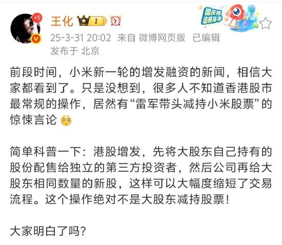 仟茂科技讯 3月31日晚间消息,小米集团公关部总经理王化在微博发文表示:“前段时间,小米新一轮的增发融资的新闻,相信大家都看到了。只是没想到,很多人不知道香港股市最常规的操作,居然有‘雷军带头减持小米股票’的惊悚言论。” 他还谈到,“港股增发,先将大股东自己持有的股份配售给独立的第三方投资者,然后公司再给大股东相同数量的新股,这样可以大幅度缩短了交易流程。这个操作绝对不是大股东减持股票!” 来源:仟茂网 (责任编辑:宋政 HN002)