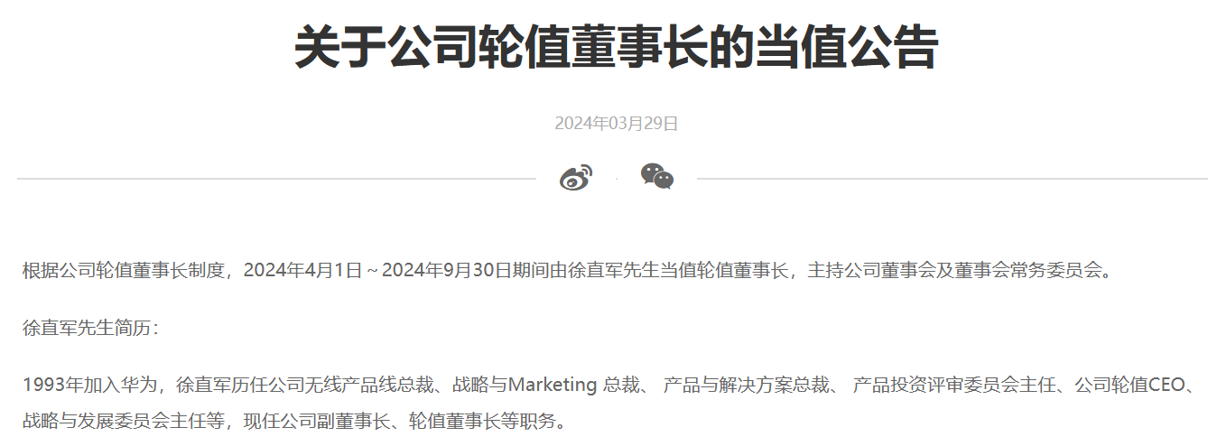 凤凰网科技讯 (作者/彭坤苹)4月1日,华为官网发布“关于公司轮值董事长的当值公告”,宣布2024年4月1日-2024年9月30日期间由徐直军先生当值轮值董事长,主持公司董事会及董事常务委员会。 据了解,徐直军1993年加入华为,历任公司无线产品线总裁、战略与Marketing总裁、 产品与解决方案总裁、 产品投资评审委员会主任、公司轮值CEO、战略与发展委员会主任等,现任公司副董事长、轮值董事长等职务。 (责任编辑:刘静 HZ010)