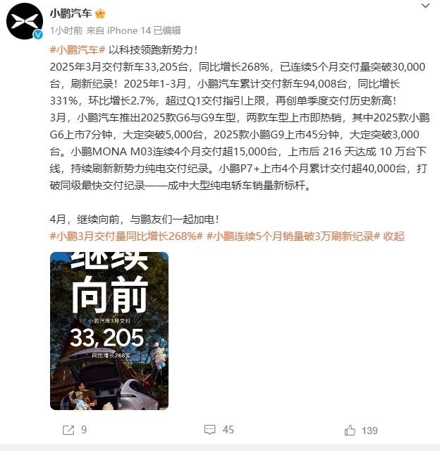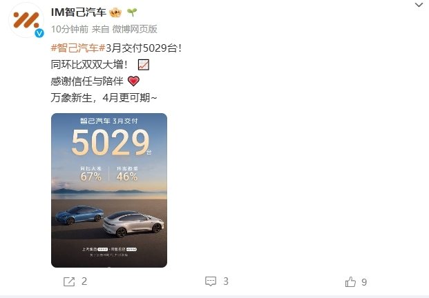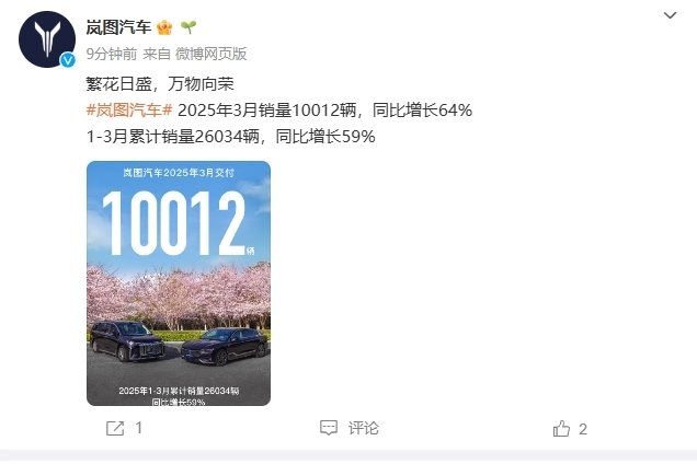 凤凰网科技讯 (作者/杨睿琪) 4月1日,各大车企今日起陆续交出了2025年3月份销量、交付量的成绩单。 其中,小鹏汽车3月共交付智能电动汽车33,205辆。2025年第一季度,小鹏汽车共累计交付94,008辆智能电动车,同比增长331%。公司已连续第五个月交付量超过30,000辆。 零跑汽车3月交付量37095辆,同比增长超154%。B系列首款全球化车型B10即将正式上市。 小米汽车3月交付量超29000台。 智己汽车3月交付5029辆,同比增长67%。 岚图汽车3月销量10012辆,同比增长64%。 凤凰网科技注:本文随各车企数据的公布正在进行更新。 (责任编辑:贺 )