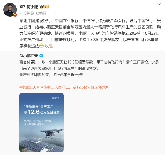 仟茂科技讯 4月1日下午消息,今日,小鹏汇天官方发布信息,称获12.6亿银团贷款,用于支持飞行汽车量产工厂建设,这是目前全球最大单笔用于飞行汽车生产的银团贷款。 何小鹏转发后表示:感谢中国建设银行(601939)、中国农业银行(601288)、中信银行(601998)作为联合牵头行,联合中国银行(601988)、兴业银行(601166),给与小鹏汇天目前全球范围内最大一笔用于飞行汽车生产的银团贷款,助力低空经济更稳健、快速的发展。小鹏汇天飞行汽车智造基地在2024年10月27日正式在广州动工,目前进展顺利,也欢迎2026年更多鹏友可以来看看飞行汽车是怎样制造的。(罗宁) (责任编辑:宋政 HN002)