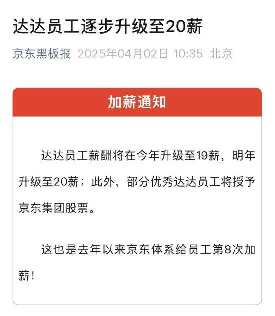 仟茂科技讯 4月2日上午消息,“京东黑板报”发文称,达达员工薪酬将在今年升级至19薪,明年升级至20薪;此外,部分优秀达达员工将授予京东集团股票。这也是去年以来京东体系给员工第8次加薪。