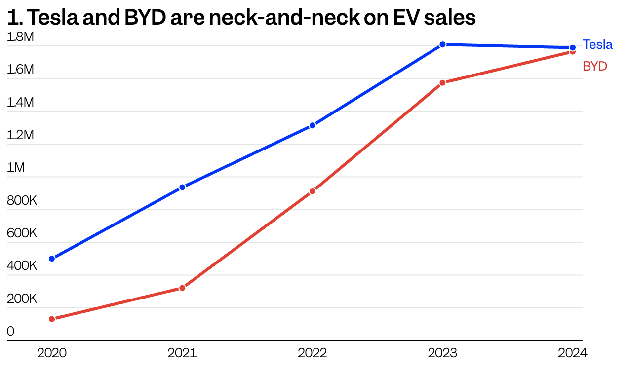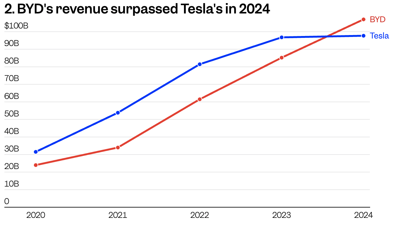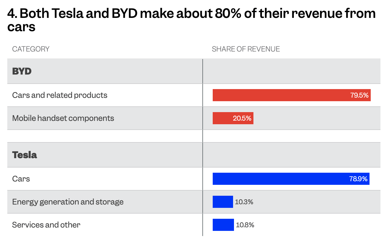 比亚迪与特斯拉 凤凰网科技讯 北京时间4月2日,比亚迪与特斯拉正在激烈争夺世界头号纯电动汽车制造商的桂冠,这两家公司谁更强?《商业内幕》通过5张图对比了两家公司目前的优劣势。 《商业内幕》分别通过纯电动汽车销量、年营收、年利润、汽车业务收入占比、股价表现来对比两家公司,发现他们旗鼓相当。 1.纯电动汽车销量:特斯拉领先 销量旗鼓相当 2024年,特斯拉的纯电动汽车销量约为179万辆,领先比亚迪的176万辆。但是如果算上混合动力车,比亚迪2024年的整体销量达到427万辆,远超特斯拉。 2.年营收:比亚迪领先 比亚迪年营收超特斯拉 2024年,比亚迪的年营收达到7771.02亿元人民币(约合1070亿美元),超过了特斯拉的977亿美元。这是比亚迪营收自2018年以来首次超过特斯拉。 3.净利润:特斯拉领先 特斯拉净利润超比亚迪 2024年,比亚迪净利润同比增长34%至402.54亿元人民币(约合55.47亿美元),落后于特斯拉的71亿美元。 4.汽车收入占比:比亚迪领先 汽车收入占比相当 特斯拉、比亚迪与传统汽车制造商的一个区别在于,它们的业务不只是生产汽车。不过,汽车业务在两家公司营收的占比相当。比亚迪略微领先,来自汽车和相关产品的营收比重为79.5%,特斯拉为78.9%。 5.股价表现:比亚迪领先 比亚迪今年股价表现好于特斯拉 由于投资者担心马斯克过于关注他在政府效率部的工作以及特斯拉销量下滑,特斯拉股价开年大跌,2025年已累计下滑了30%。相比之下,比亚迪股价则飙升,今年为止已经增长了逾40%。在比亚迪宣布闪充技术当天,特斯拉股价下跌了5%。(作者/箫雨) (责任编辑:刘畅 )