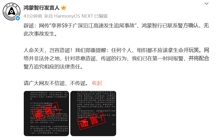 凤凰网科技讯 (作者/彭坤苹)4月2日,鸿蒙智行发言人就网传信息“享界S9于广深沿江高速发生追尾事故”发布辟谣说明:鸿蒙智行已联系警方确认,无此次事故发生。 鸿蒙智行表示,任何个人、组织都不应该拿生命开玩笑。网络并非法外之地,针对恶意造谣、传谣的行为,我们已在第一时间报警,并将配合警方追究相应的法律责任。请广大网友不信谣、不传谣。 (责任编辑:刘静 HZ010)