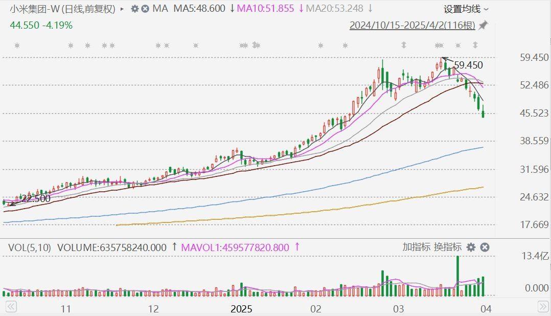 格隆汇4月2日|受小米SU7事故事件影响,小米集团(1810.HK)股价继续走低。截至收盘,该股报44.55港元/股,较2025年3月19日的历史最高价59.45港元/股已跌去25.06%。按照最新市值计算,小米集团总市值近两天缩水超1200亿港元。 (责任编辑:宋政 HN002)
