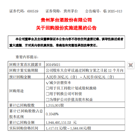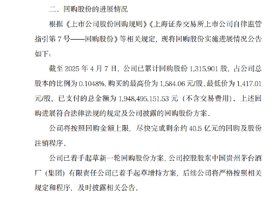 4月8日上午,贵州茅台(600519)发布公告表示,公司将按照回购金额上限尽快完成剩余约40.5亿元的回购及股份注销程序,并已着手起草新一轮回购股份方案。同时,控股股东中国贵州茅台(600519)酒厂(集团)有限责任公司已着手起草增持方案。 此前,贵州茅台酒股份有限公司于2024年11月27日召开2024年第一次临时股东大会,审议通过了《关于以集中竞价交易方式回购公司股份的方案》,决定以公司自有资金通过集中竞价交易方式回购股份,用于注销并减少注册资本,回购价格不超过1.771.90元/股(含),回购金额不低于人民币30亿元(含)且不超过人民币60亿元(含)。 截至2025年4月7日,茅台已累计回购股份1315901股,占公司总股本的比例为0.1048%,购买的最高价为1584.06元/股、最低价为1417.01元/股,已支付的总金额为1948495151.53元(不含交易费用)。(张奥) (责任编辑:宋政 HN002)