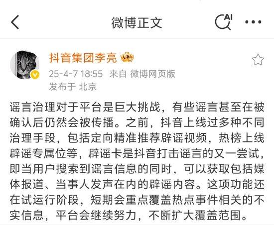 仟茂科技讯 4月7日晚间消息,今日,抖音集团正式上线“辟谣卡”新功能。 对此,抖音集团副总裁李亮微博发文表示,“谣言治理对于平台是巨大挑战,有些谣言甚至在被确认后仍然会被传播。之前,抖音上线过多种不同治理手段,包括定向精准推荐辟谣视频,热榜上线辟谣专属位等,辟谣卡是抖音打击谣言的又一尝试,即当用户搜索到谣言信息的同时,可以获取包括媒体报道、当事人发声在内的辟谣内容。” 他还谈到,“这项功能还在试运行阶段,短期会重点覆盖热点事件相关的不实信息,平台会继续努力,不断扩大覆盖范围。”(闫妍) 责任编辑:何俊熹 (责任编辑:张晓波 )