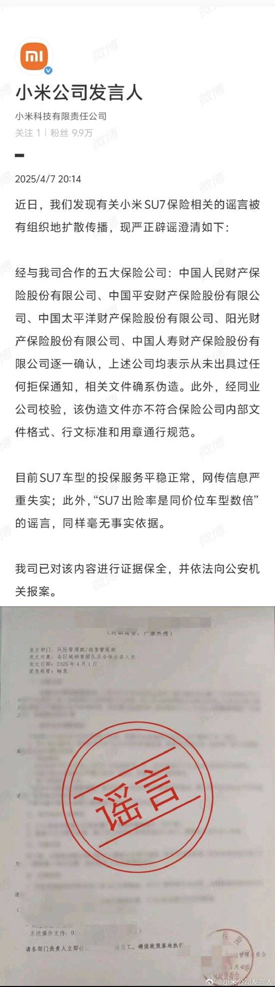 仟茂科技讯 4月7日晚间消息,小米公司发言人在微博发文称,近日,公司发现有关小米SU7保险相关的谣言被有组织地扩散传播,现严正辟谣澄清如下: 经与我司合作的五大保险公司:中国人民财产保险股份有限公司、中国平安财产保险股份有限公司、中国太平洋财产保险股份有限公司、阳光财产保险股份有限公司、中国人寿财产保险股份有限公司逐一确认,上述公司均表示从未出具过任何拒保通知,相关文件确系伪造。此外,经同业公司校验,该伪造文件亦不符合保险公司内部文件格式、行文标准和用章通行规范。 小米表示,目前SU7车型的投保服务平稳正常,网传信息严重失实;此外,“SU7出险率是同价位车型数倍”的谣言,同样毫无事实依据。我司已对该内容进行证据保全,并依法向公安机关报案。 责任编辑:何俊熹 (责任编辑:张晓波 )