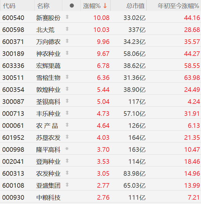 格隆汇4月9日|A股市场农业股继续走强,其中,新赛股份(600540)、北大荒(600598)、万向德农(600371)涨停,神农种业、宏辉果蔬(603336)、雪榕生物(300511)、敦煌种业(600354)、荃银高科(300087)、丰乐种业(000713)、农产品(000061)、苏垦农发(601952)、隆平高科(000998)、登海种业(002041)、农发种业(600313)等跟涨。 (责任编辑:宋政 HN002)