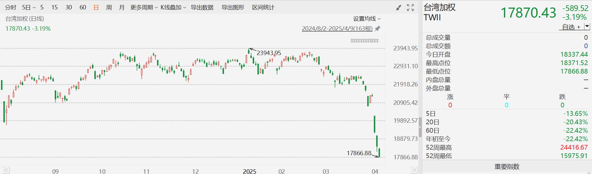 格隆汇4月9日|台湾加权指数跌幅扩大至3%,报17,905.18点。