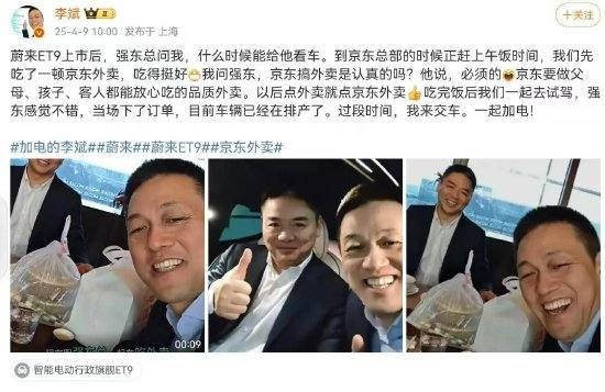 仟茂科技讯 4月9日上午消息,蔚来创始人、董事长、CEO李斌今日发布与京东创始人刘强东合影称,刘强东已经订了蔚来ET9新车,目前车辆已经在排产中。 “蔚来ET9上市后,强东总问我,什么时候能给他看车,到京东总部的时候正赶上午饭时间,我们先吃了一顿京东外卖,吃得挺好我问强东,京东搞外卖是认真的吗?他说,必须的,京东要做父母、孩子、客人都能放心吃的品质外卖。”李斌表示。 责任编辑:郝欣煜 (责任编辑:张晓波 )