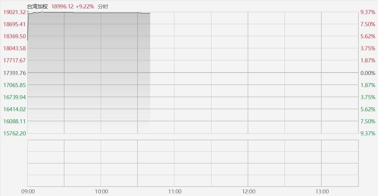 格隆汇4月10日|台湾加权指数盘中一度涨9.37%,报19021.32点。台积电、鸿海、联发科、台达电、广达、长荣、纬颖、华硕、大立光全部涨停。台湾金管会主委最新表示,周六下午宣布下周是否延长暂行稳定股市措施。 消息面上,美国总统特朗普宣布对不采取报复行动的国家和地区实施90天关税暂停,并在此期间大幅降低对其他国家和地区的对等关税至10%,立即生效。 (责任编辑:宋政 HN002)
