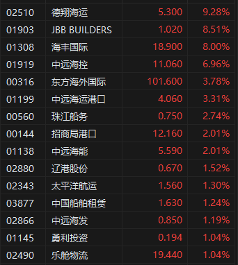 4月10日消息,港股三大指数冲高回落。截至午间收盘,恒生指数涨1.80%,报20628.86点,恒生科技指数涨2.36%,国企指数涨1.41%。盘面上,科网股普涨,联想集团涨超6%,快手涨超4%,小米集团、京东集团涨超2%,腾讯控股、阿里巴巴、百度集团涨超1%;苹果概念股早盘冲高,荣阳实业涨超13%;航运及港口板块大涨,德翔海运涨超9%。 苹果概念股早盘冲高,荣阳实业涨超13%。美国总统特朗普当地时间9日表示,已授权对不采取报复行动的国家实施90天的关税暂停。特朗普在讲话中表示,会考虑对部分美国公司豁免关税,苹果作为美国“旗舰企业”之一,被视为豁免的潜在候选。隔夜苹果股价大涨15.33%,重回全球“市值第一”。 航运及港口板块大涨,德翔海运涨超9%。美国总统特朗普当地时间9日表示,已授权对不采取报复行动的国家实施90天的关税暂停。受消息影响,国内商品期货早盘开盘后,集运欧线主力合约一度涨停。小摩此前指出,关税增加是全球贸易的一大阻碍,从总体上看是货运行业需求基本面的不利因素。集装箱航运公司所受影响最为严重。这类企业采用资产密集型商业模式,且运价波动对其经营杠杆效应显著,而运价水平受供需关系直接影响。 来源:仟茂网 (责任编辑:宋政 HN002)