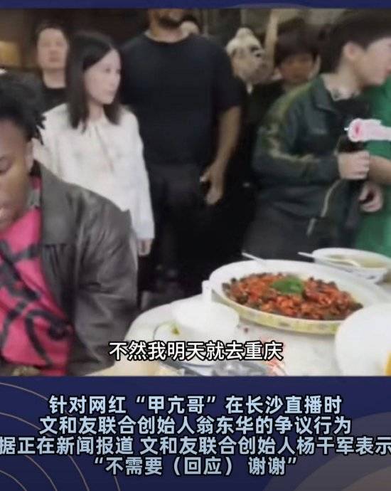 近日,Youtube拥有超3800万订阅者的美国博主“甲亢哥”,到长沙进行直播。期间,长沙知名餐厅文和友联合创始人翁东华频频抢镜,并自称“I am boss,I am boss!(我是老板)“,要求与甲亢哥同座的重庆卤鹅大叔起身让座。他还说道,“我们都是做餐饮的,请起来一下,我来介绍一下,不然我明天就去重庆。” 此外,直播中翁东华还存在大吼大叫等行为,被网友批评不尊重人。对于上述行为,文和友联合创始人杨干军向媒体表示,“不需要(回应),谢谢。” 截至目前,长沙文和友(海信广场店)大众点评评论区已遭到大量网友打出低分。有网友表示,完全无法理解“不然明天我就去重庆”是出于什么目的说出来的,法治社会搞开威胁了。(张奥) (责任编辑:宋政 HN002)