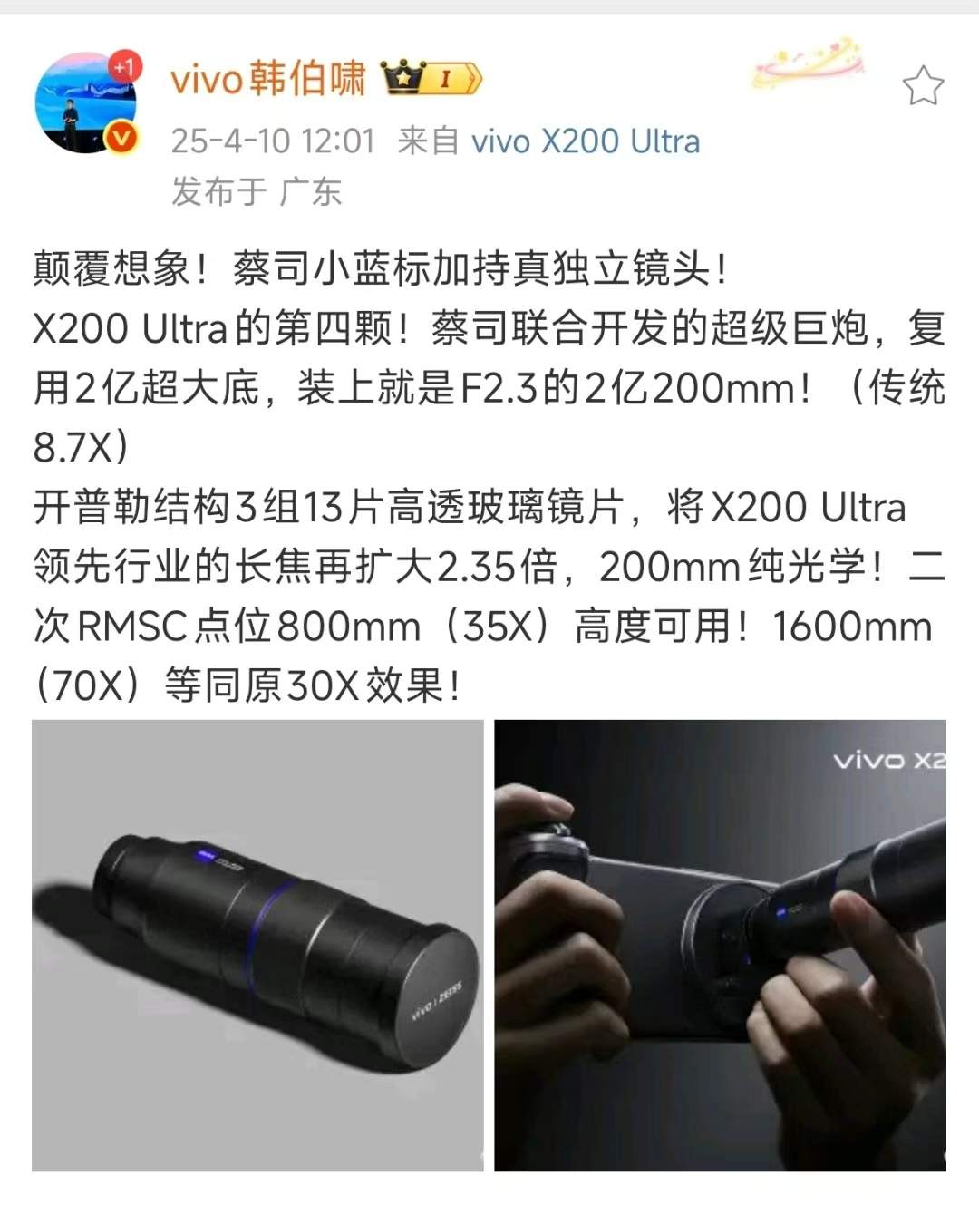 凤凰网科技讯(作者/于雷)4月10日,vivo通信科技有限公司产品经理韩伯啸微博爆料,即将发布的vivo X200 Ultra将支持外接镜头。昨日其曝光了新机的摄影套装,埋下伏笔“最厉害的还不能说”而外接镜头或为这个“厉害”的卖点。 据韩伯啸发文透露,X200 Ultra的第四颗外接镜头是与蔡司联合开发的超级巨炮,复用2亿超大底,装上就是F2.3的2亿200mm(传统8.7X)。 开普勒结构3组13片高透玻璃镜片,将X200 Ultra长焦再扩大2.35倍,构成200mm纯光学。次RMSC点位800mm(35X)高度可用,1600mm(70X)等同原30X效果。 昨日公开的摄影套装手柄采用Type-C连接方式,内置2300mAh的电池,套装设计中集成了支架功能,可轻松实现竖立稳定的拍摄机位。 据悉,vivo X200 Ultra将于4月21日正式发布。 (责任编辑:贺 )