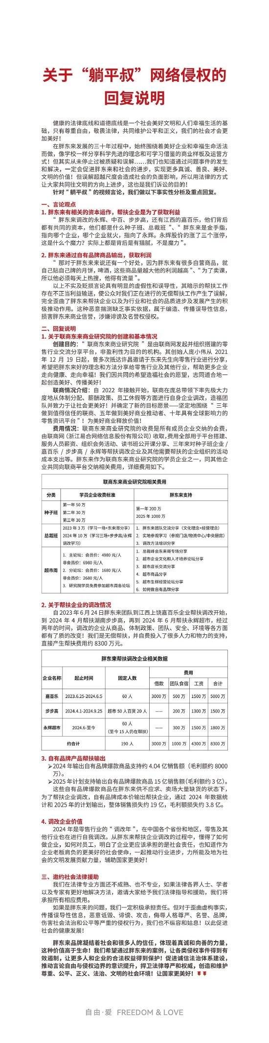 4月9日夜间,胖东来商贸集团发布了关于“躺平叔”、“柴怼怼”、“宋清辉”网络侵权的回复说明,其中对“联商东来商业研究院”的创建和基本情况作出进一步解释。 关于外界关注的盈利问题,胖东来表示,该研究院由联商网发起并组织搭建的零售行业交流分享平台,非盈利性为目的的机构。 “联商东来商业研究院”的收费是所有成员企业交纳的会费,由联商网(浙江易合网络信息股份有限公司)收取,费用全部用于平台搭建、服务人员薪资、组织会务活动、读书班公开课分享、三年来对种子班企业嘉百乐/步步高(002251)/永辉等帮扶调改企业及其他需要帮扶的企业组织的活动成本支出等。 胖东来作为“联商东来商业研究院”的学员企业之一,同其他企业共同向联商平台交纳相关费用。据悉,“联商东来商业研究院”划分为三档收费,分别是种子班、总裁班、超市周。 另外,关于帮扶企业的调改情况,胖东来也表示,“我们是无偿帮扶,并自费投入了很多人力和物力的支持,直接产生帮扶费用约 8300 万元。”(张奥) (责任编辑:宋政 HN002)