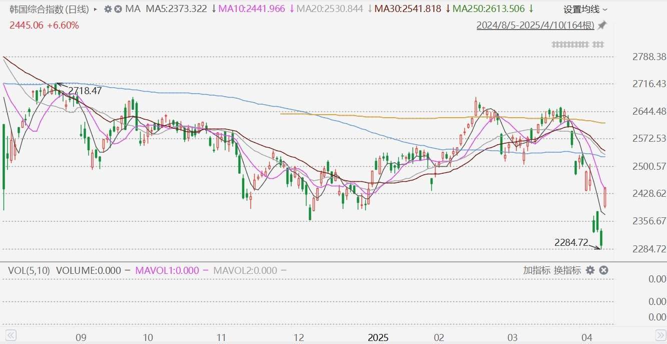 格隆汇4月10日|美国贸易政策出现缓和迹象,韩股大涨。韩国综合指数今日收盘上涨151.36点,涨幅6.6%,报2445.06点。
