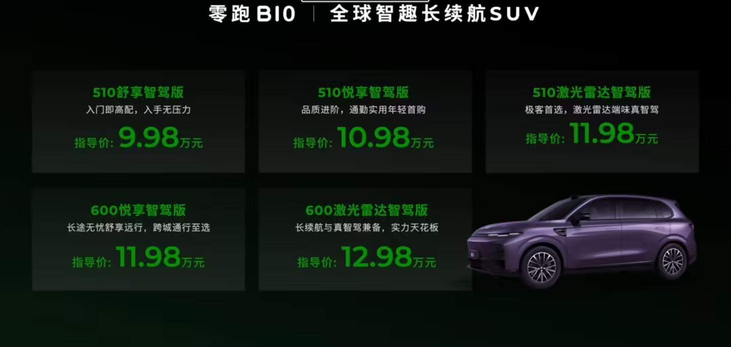 凤凰网科技讯 (作者/彭坤苹)4月10日,零跑汽车全新车型零跑B10现已正式上市,官方售价区间为9.98万-12.98万元。 外观设计上,B10前脸采用了当下流行的贯穿式头灯,搭配隐藏式门把手,符合新能源车型的时尚风格。车尾同样配备贯穿式灯组,与前脸造型相互呼应,提升了车辆整体的辨识度。车身尺寸方面,其长宽高分别为 4515*1885*1655mm,轴距达2735mm,展现出较为宽敞的车内空间。 在智能驾驶上,零跑B10搭载了激光雷达与8650芯片的智能驾驶方案,能够实现高速及城区自动领航辅助,智能座舱则采用8295芯片,并接入云端大模型的语音助手,极大地提升了人机交互的智能化水平。 同时,零跑B10与Stellantis集团玛莎拉蒂团队联合进行底盘调校,确保了车辆优秀的操控性能。座舱采用个性化空间设计,用户可通过 “魔术拓展孔” 自由搭配折叠桌板、手机支架等配件,满足多样化需求。 座舱内部,后排配备了空调出风口和手机充电接口,为后排乘客提供舒适便利。采用5座座椅布局,后排中央座椅设有头枕,前排座椅靠背可实现最大180°放平,后排座椅支持6:4比例放倒,极大地拓展了车内空间的灵活性与实用性。 动力方面,零跑B10提供132kW和160kW两个单电机版本供消费者选择。纯电续航有 510km版本和600km版本,0-100km/h加速时间为6.8秒。车辆搭载800 高压平台,支持快充,电量从30%充到80%仅需19分钟。 (责任编辑:郭健东 )