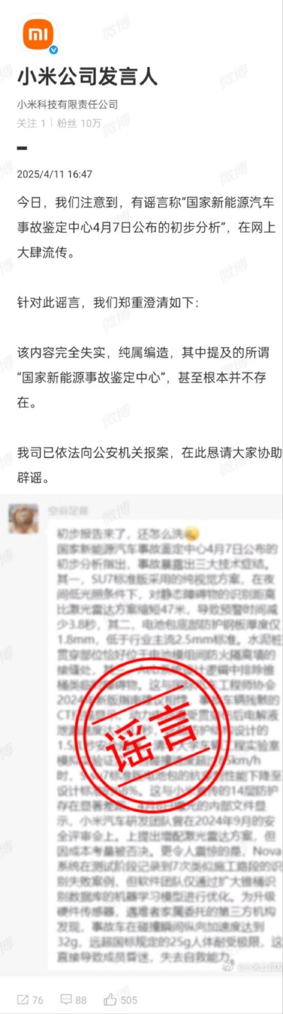 4月11日下午消息,小米官方微博@小米公司发言人下午发布声明称,今日注意到,有谣言称“国家新能源汽车事故鉴定中心4月7日公布的初步分析”,在网上大肆流传。该内容完全失实,纯属编造,其中提及的所谓“国家新能源事故鉴定中心”,甚至根本并不存在。该公司已依法向公安机关报案。 责任编辑:刘万里 SF014 (责任编辑:郭健东 )