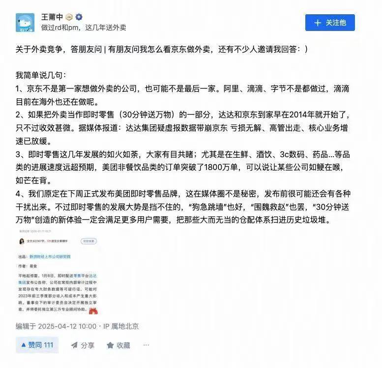 今日早间,“被美团高管暗贬,刘强东回应了”的消息冲上热搜。 有消息称,4月12日上午 ,针对近期京东高调进军外卖市场,美团核心本地商业CEO王莆中在社交媒体发表评论称,京东不是第一家想做外卖的公司,也可能不是最后一家。同时表示美团在3c数码、药品、生鲜等非餐饮品类的进展速度远超预期,让某些公司如鲠在喉,如芒在背。 4月12日中午,京东创始人刘强东在回应京东集团新闻发言人齐珊珊有关“王莆中下场攻击我们”的提问时表示:要是有空就赶紧去加入“小哥应急小组”,看看有没有外卖或者快递兄弟在大风中遇到困难的!或者去参与出口受阻企业的采购小组工作,尽快给他们提供帮助。刘强东告诉齐珊珊,“不要和人打口仗,不能产生社会价值。” 对于刘强东的回应,证券时报・e公司记者向京东方面进行求证,并得到确认。 回溯来看,4月12日上午,名为王莆中的账号在知乎平台上发文,谈到京东入局外卖赛道一事。王莆中表示,“京东不是第一家想做外卖的公司,也可能不是最后一家。阿里、滴滴、字节不是都做过,滴滴目前在海外也还在做。如果把外卖当作即时零售(30分钟送万物)的一部分,达达和京东到家早在2014年就开始了,只不过收效甚微。” 王莆中还表示,即时零售这几年发展如火如荼,大家有目共睹,尤其是在生鲜、酒饮、3c数码、药品等品类的进展速度远超预期,美团非餐饮品类的订单突破了1800万单,可以说让某些公司如鲠在喉,如芒在背。 王莆中透露,原定在下周正式发布美团即时零售品牌,这在媒体圈不是秘密,发布前很可能还会有各种干扰出来。不过即时零售的发展大势是挡不住的,“狗急跳墙”也好,“围魏救赵”也罢,“30分钟送万物”创造的新体验一定会满足更多用户需要,把那些大而无当的仓配体系扫进历史垃圾堆。 证券时报・e公司记者登录知乎平台发现,该账号在个人资料中显示其在美团负责相关业务。同时,该账号在1月7日发文称,“我是美团王莆中,邀请各位知友加入‘互联网破局者’问答”,并配有海报,显示其为美团核心本地商业CEO王莆中。与此同时,记者向知乎方面求证得知,该账号的确为美团核心本地商业CEO王莆中个人账号,今年1月,王莆中受邀来到知乎参加活动。 值得一提的是,中国外卖市场前景广阔,目前美团和饿了么占据主要市场份额。自今年2月上线外卖业务以来,京东不断加大投入,已经搅动“行业江湖”成为共识。 4月10日,京东外卖对外宣布,将于4月11日早8点正式上线百亿补贴。京东外卖将通过“全民补贴+爆品直降”双重机制,计划一年内投入超100亿元,后续平台将持续出台一系列补贴举措和商家扶持政策。 4月9日,蔚来创始人、董事长、CEO李斌在微博发布与京东创始人刘强东合影,李斌表示,“蔚来ET9上市后,强东总问我,什么时候能给他看车,到京东总部的时候正赶上午饭时间,我们先吃了一顿京东外卖,吃得挺好。我问强东,京东搞外卖是认真的吗?他说,必须的,京东要做父母、孩子、客人都能放心吃的品质外卖。” 近日,京东外卖还首次对外披露日单量成绩单。3月24日,京东外卖对外宣布,上线40天,日订单量已突破100万。文中称,“0佣金”政策助商家获益,平台上已涌现大量月销订单突破2000单门店。目前,京东外卖平台上,已有超45万家品质堂食餐厅为全国142城用户提供餐品。 在完善骑手福利保障方面,2月19日,京东集团宣布,自2025年3月1日起,京东将逐步为京东外卖全职骑手缴纳五险一金,为兼职骑手提供意外险和健康医疗险。继给快递小哥缴纳五险一金后,京东再次成为首个为外卖骑手缴纳五险一金的平台。 2月24日下午,据京东黑板报发文称,京东集团宣布,鉴于目前外卖骑手的平均薪酬远低于京东快递小哥,为了薪酬公平性,未来一段时期签约的外卖全职骑手缴纳五险一金的所有成本,包含个人所需缴纳部分,全部由京东承担,确保骑手现金收入绝不会因为缴纳五险一金而减少,此项举措包含现有骑手和新加入的骑手。 本文首发于微信公众号:e公司官微。文章内容属作者个人观点,不代表和讯网立场。投资者据此操作,风险请自担。 (责任编辑:王治强 HF013)