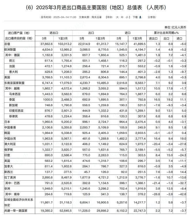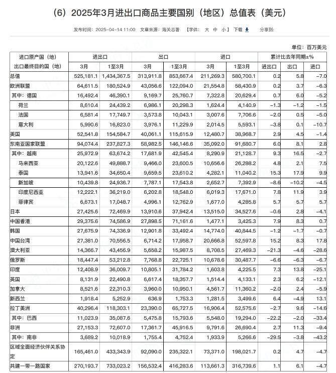 格隆汇4月14日|按人民币计,中国1-3月对美国进出口11103.3亿元,同比增长4%。其中,出口8304.5亿元,同比增5.6%,进口2798.8亿元,同比降0.3%。 按美元计,中国1-3月对美国进出口1545.84亿美元,同比增长2.9%。其中,出口1156.16亿美元,同比增4.5%,进口389.68亿美元,同比降1.4%。 (责任编辑:宋政 HN002)