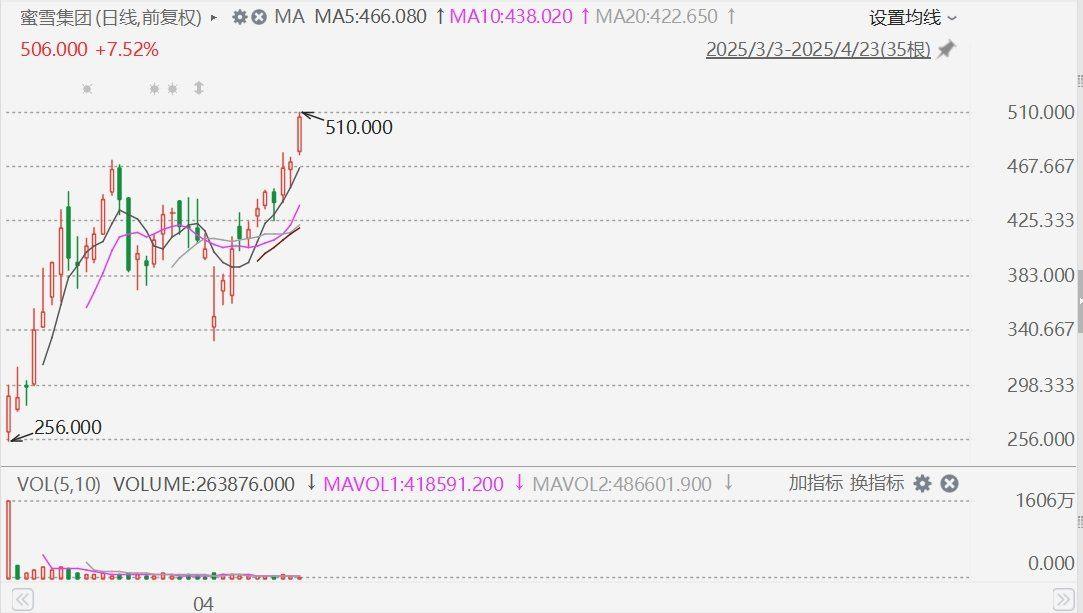 格隆汇4月23日|蜜雪集团(2097.HK)拉升涨超8%至510港元,再创历史新高,市值达1938亿港元,稳居中国餐饮类上市公司市值第一。蜜雪集团今年3月3日在港挂牌上市,现价较IPO价格202.5港元已累涨151%。