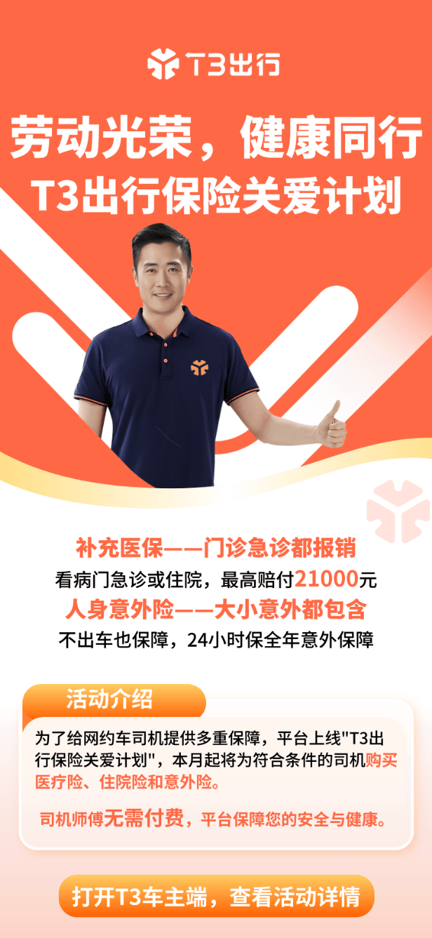 凤凰网科技讯 (作者/杨睿琪)4月23日,T3出行宣布正式上线司机医疗保险关爱计划,首次将门急诊、住院医疗及意外伤害纳入保险保障体系。根据官方披露,该平台首批投入数千万元专项资金,为全国符合资质的网约车司机免费提供为期一年的综合保险,单人保额最高可达15万元。 门急诊医疗方面,被保险司机在保障期内于二级以上公立医院就诊,可报销医保范围内实际支出的80%。住院医疗方面,被保险司机在保障期内于二级以上公立医院住院,扣除免赔额后可报销医保范围内实际支出的90%。另外,还可享受50元/天的住院津贴,单次补贴上线最高可达4500元。 值得注意的是,此次保障计划还专门丰富了意外险的保障范围,除开车接单场景外,司机在其他场景因外来、突发、非疾病导致的意外,也可享受门急诊医疗、住院、伤残、身故赔偿等保险保障,具体发放形式可详见T3车主端。 目前,司福计划已经相继落地了司机保险体系、司机荣誉勋章体系、司机子女高考奖励计划、司机驿站、特别关爱慰问金、免费体检福利、女性司机专项关怀、司机受委屈关怀等20多项举措。