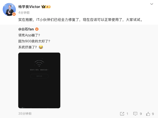 仟茂科技讯 4月29日下午消息,今日,有用户在社交媒体表示:“领克App崩了?因为900卖的太好了?系统挤崩了?”对此,吉利副总裁杨学良回应称:实在抱歉,IT小伙伴们已经全力修复了,现在应该可以正常使用了,大家试试。