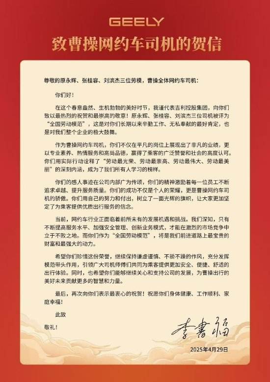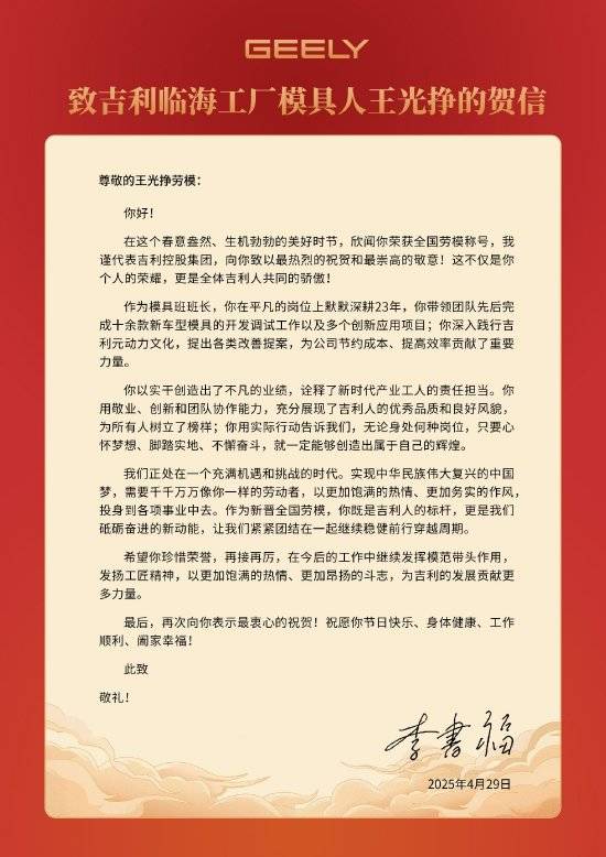 仟茂科技讯 4月29日下午消息,吉利旗下的曹操专车三名网约车司机,以及临海工厂的模具班班长,共计四人,荣获全国劳模称号。吉利控股集团董事长李书福亲笔写下贺信。 在致古利临海工厂模具人王光挣的贺信中,李书福表示,我谨代表吉利控股集团,向你致以最热烈的祝贺和最崇高的敬意!这不仅是你个人的荣耀,更是全体吉利人共同的骄傲!作为模具班班长,你在平凡的岗位上默默深耕23年,你带领团队先后完成十余款新车型模具的开发调试工作以及多个创新应用项目,你深入践行吉利元动力文化,提出各类改善提案,为公司节约成本、提高效率贡献了重要力量。 在致曹操网约车司机的贺信中,李书福表示,作为曹操网约车司机,你们不仅在平凡的岗位上展现出了非凡的业绩,更以专业素养、热情服务和高尚品德,赢得了乘客的广泛赞誉和社会的高度认可你们用实际行动诠释了“劳动最光荣、劳动最崇高、劳动最伟大、劳动最美丽”的深刻内涵,成为了我们所有人学习的榜样。 “当前,网约车行业正面临着前所未有的发展机遇和挑战。我们深知,只有不断提高服务水平、加强安全管理、创新业务模式,才能在激烈的市场竞争中立于不败之地。而你们作为‘全国劳动模范’,将是我们前进道路上最宝贵的财富和最强大的动力。”