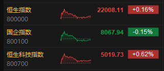 4月29日消息,港股三大指数冲高回落,截至收盘,恒生指数涨0.16%,报22008.11点,恒生科技指数涨0.62%,国企指数跌0.15%。盘面上,科网股涨跌不一,美团涨近3%,京东集团涨近2%,哔哩哔哩涨超1%,腾讯控股跌超1%;生物技术板块持续上涨,中国抗体涨超15%,科伦博泰生物、云顶新耀涨近10%;茶饮股集体上行,奈雪的茶涨超8%。