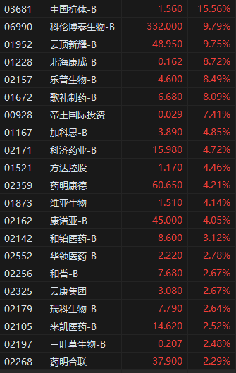 生物技术板块持续上涨,中国抗体涨超15%,科伦博泰生物、云顶新耀涨近10%。国投证券发布研报称,全球创新药投融资环境有所复苏,多肽、ADC等细分领域创新研发蓬勃兴起,加速推动CXO行业景气度上行,研发生产外包需求有望逐步改善。目前CXO上市公司相关订单开始逐步改善且产能处于行业领先地位,看好CXO上市公司业绩边际改善。