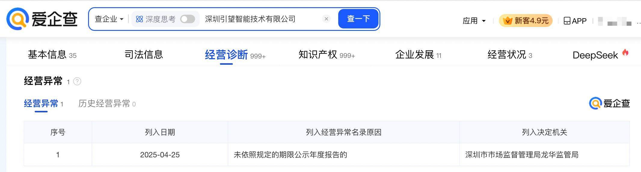 凤凰网科技讯 4月29日,华为技术有限公司持股80%的深圳引望智能技术有限公司近日因未依照规定期限公示年度报告,被深圳市市场监督管理局龙华监管局列入经营异常名录。