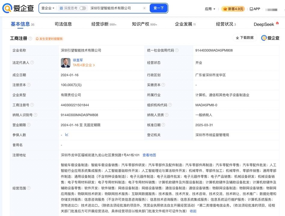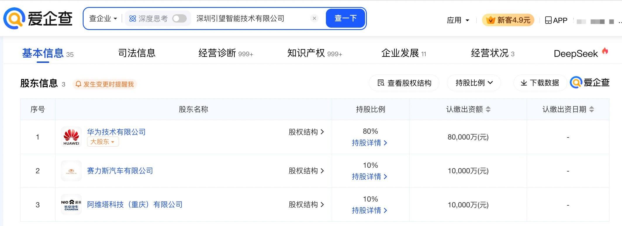 图源 爱企查App “引望”全称为“深圳引望智能技术有限公司”,工商变更后由华为、阿维塔、赛力斯共同持股、独立运作。公司已于3月31日完成工商变更,阿维塔与赛力斯分别入股10%。 据爱企查App显示,深圳引望智能技术有限公司成立于2024年1月,法定代表人为徐直军,注册资本高达10亿元人民币。该公司由华为技术有限公司作为主要股东持股80%,赛力斯汽车有限公司和阿维塔科技(重庆)有限公司各持股10%。