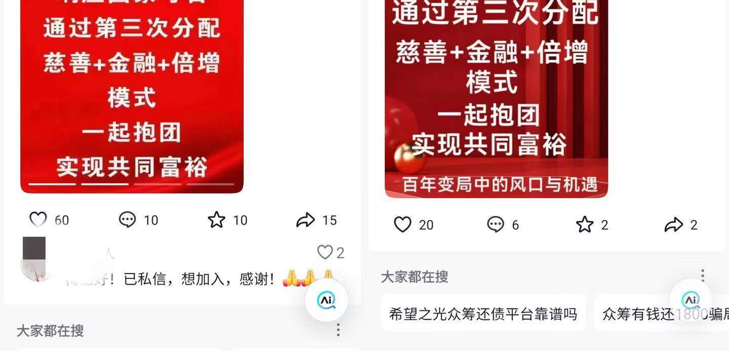 “1800元,即可偿还百万债务!”“3至9个月让你实现无债一身轻!”“偿债模式已长期运营,背后没有公司运营。安全可靠!” 近期,一种打着“众筹还债”旗号的所谓的债务解决方案在网上出现。 来自河北的王先生(化名)在电话中告诉《每日经济新闻》记者,这是一个“捐赠爱心”的项目,只要一次性向9个人捐赠1800元,就有机会开启百万元的众筹之旅。为了吸引记者加入,王先生分享了一个所谓的案例:他的朋友仅用两个月时间就成功筹集了10万元。在交流过程中,记者得知王先生在北京工作的儿子已经成家,但收入有限,他正寄希望于通过参与这个项目,为他在北京的儿子购置一套房产。 从记者了解的实际情况来看,该项目已涉及各个社交平台的大量群聊,其中不乏规模超200人的“大群”。那么,这些社会上的普通人,究竟如何被卷入局中?