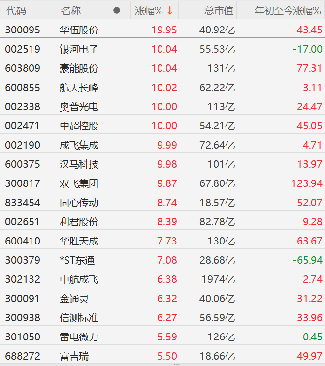 格隆汇5月8日|A股市场军工股今日再度集体走强,其中,华伍股份(300095)20CM涨停,银河电子(002519)、豪能股份(603809)、航天长峰(600855)、奥普光电(002338)、中超控股(002471)、成飞集成、汉马科技10CM涨停,双飞集团涨超9%,利君股份(002651)涨超8%,中航成飞、金通灵(300091)涨超6%。