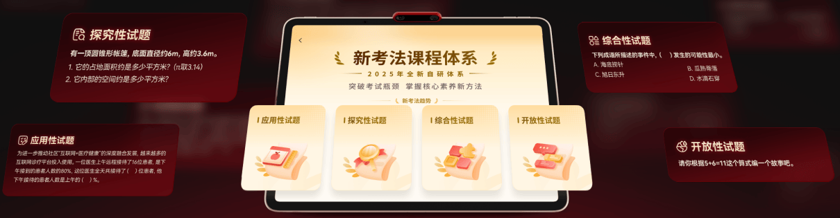 面对新课标改革带来的教育变化,学而思凭借强大的教研实力快速响应,在保证与课内教材一级目录一致的基础上,进一步细化知识点讲解,率先推出 “新课标衔接课”,为学生提供系统、全面的过渡指导,帮助学生顺利适应新课标的学习节奏。同时,“新题新考法” 功能,聚焦新课标下背景信息更复杂的 “应用性试题”、包含新知识的 “探究性试题”、跨学科的 “综合性试题”、答案不唯一的 “开放性试题” 四类新题型,通过专项训练,帮助学生掌握新题型的解题思路和方法。