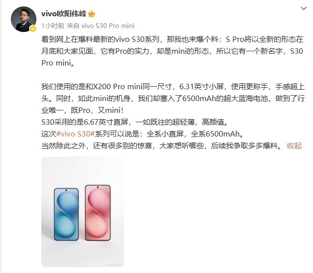 凤凰网科技讯(作者/高书柔)5月8日,vivo产品副总裁欧阳伟峰通过微博透露,S Pro即将在本月底将以全新形态亮相,号称其“有Pro的实力,却是mini的形态”,所以它有一个新名字,S30 Pro mini。