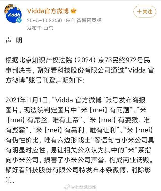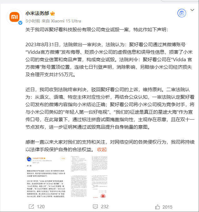 凤凰网科技讯 5月13日,小米公司诉聚好看科技股份有限公司商业诋毁一案近日尘埃落定。小米法务部官微发文称,法院作出终审判决,驳回聚好看公司上诉,维持原判,要求聚好看公司在其官方微博置顶位置连续七日刊登声明消除影响,并赔偿小米公司经济损失及合理开支共计55万元。