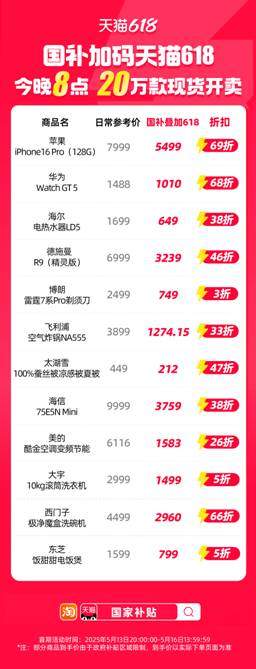 记者获悉,618第一阶段,天猫联合上千家品牌投入超百亿,积极响应国补旧换新增量政策,给消费者更大力度让利。目前,有超20万款品牌好货支持天猫618优惠与国补叠加,其中超1万款为今年首发的新品,覆盖美的、海尔、苹果、华为、戴森、西门子等全球优质品牌。 苹果直降2000元,iPhone16 Pro首次进入国补,到手价5499元。大宇10公斤滚筒洗衣机,国补叠加618优惠,打5折,到手价1499元;美的节能空调,打35折,到手价1583元;75寸Mini LED海信电视,打38折,补贴后到手价3759元;西门子极净魔盒洗碗机,打66折,到手价2960元;东芝饭甜甜电饭煲,打5折,到手价799元。