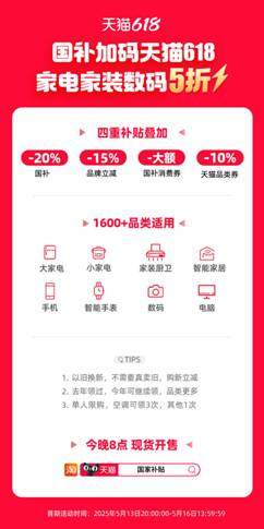 天猫618重磅加码国补,家电、家装、家居、3C数码等品类将低至5折,今晚8点,现货开卖。 今年天猫618,主打“最便宜、最简单”,玩法简化为“官方立减15%”,无需凑单一件就能打85折。在此基础上,天猫再发国补大额消费券及9折的品类券,叠加至高20%国家补贴,四重折扣后,家电、家装、家居、3C数码等品类优惠力度将低至5折,刷新全网底价。 淘宝APP搜索“国家补贴”即可直达会场,今晚20点起可领取大额国补消费券。