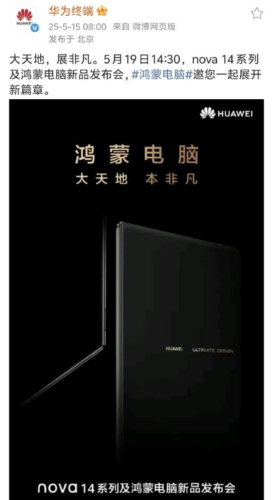 仟茂科技讯 5月15日上午消息,华为终端官方发布微博显示:5月19日14:30,nova 14系列及鸿蒙电脑新品发布会,鸿蒙电脑邀您一起展开新篇章。 据多方消息透露,这款即将发布的新品或将采用折叠形态设计,标志着华为在PC领域的一次大胆创新。从预热海报来看,其外观也延续了非凡大师系列一贯的简约美学风格,预计也将继续沿用非凡大师系列标志性的高端材料。(罗宁)