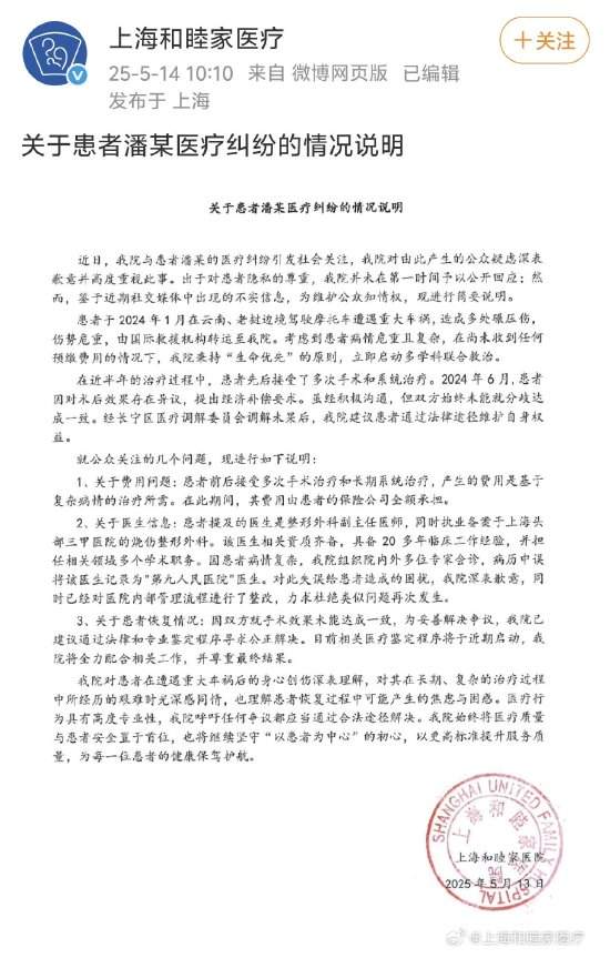 仟茂科技讯 5月15日上午消息,近日,据媒体报道,患者潘先生因交通事故,在上海和睦家接受多次手术,为此,该院称聘请到了“上海第九人民医院的整形外科专家周某i医生”主刀,但潘先生随后发现主刀医生并非宣称的“九院专家”,因此质疑上海和睦家主刀医生假冒“上海九院专家”身份。 对此,上海和睦家就费用问题、医生信息问题、患者恢复等问题发布声明: 关于费用问题,患者前后接受多次手术治疗和长期系统治疗,产生的费用是基于复杂病情的治疗所需。在此期间,其费用由患者的保险公司全额承担。 关于医生信息,患者提及的医生是整形外科副主任医师,同时执业备案于上海头部三甲医院的烧伤整形外科。该医生相关资质齐备,具备20多年临床工作经验,并担任相关领域多个学术职务。因患者病情复杂,我院组织院内外多位专家会诊,病历中误将该医生记录为“第九人民医院”医生。对此失误给患者造成的困扰,我院深表歉意,同时已经对医院内部管理流程进行了整改,力求杜绝类似问题再次发生。 关于患者恢复情况,因双方就手术效果未能达成一致,为妥善解决争议,我院已建议通过法律和专业鉴定程序寻求公正解决。目前相关医疗鉴定程序将于近期启动,我院将全力配合相关工作,并尊重最终结果。